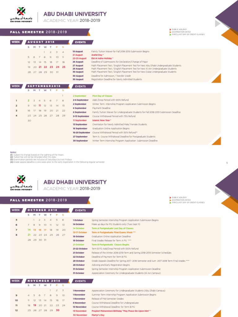 Fall 2018 * events dates days of week first day of classes aug 27 m last day to add classes without instructor permission aug 31 f labor day holiday sep 3 m add/drop, pass/no pass, audit deadline1 sep 10 m fall recess oct 8 m last day to withdraw1 important dates and academic calendars. Early admission in fall 2018/2019 for bachelor and diploma programs. This calendar reflects only the holidays observed during academic semesters. Uab academic calendars by year. View detailed dates and deadlines for each term of the academic year, or jump to a specific week of instruction. Announcement on timetables for resit special examinations in semester 3 2018 2019. Schedule of classes published for spring 2019 term. Orientation week instructional period week 1 week 2 week 3 week 4 week 5 week 6 recess week week 7 week 8 week 9 week 10 week 11 week 12 week 13 reading week examination. Orientation and registration of new entrants. Fall, 2018 semester (new intake). Subscribe to the academic calendar with google calendar or ios calendar. It is presented for action. Last day for withdrawal from courses for fall 2018 (wp/wf).