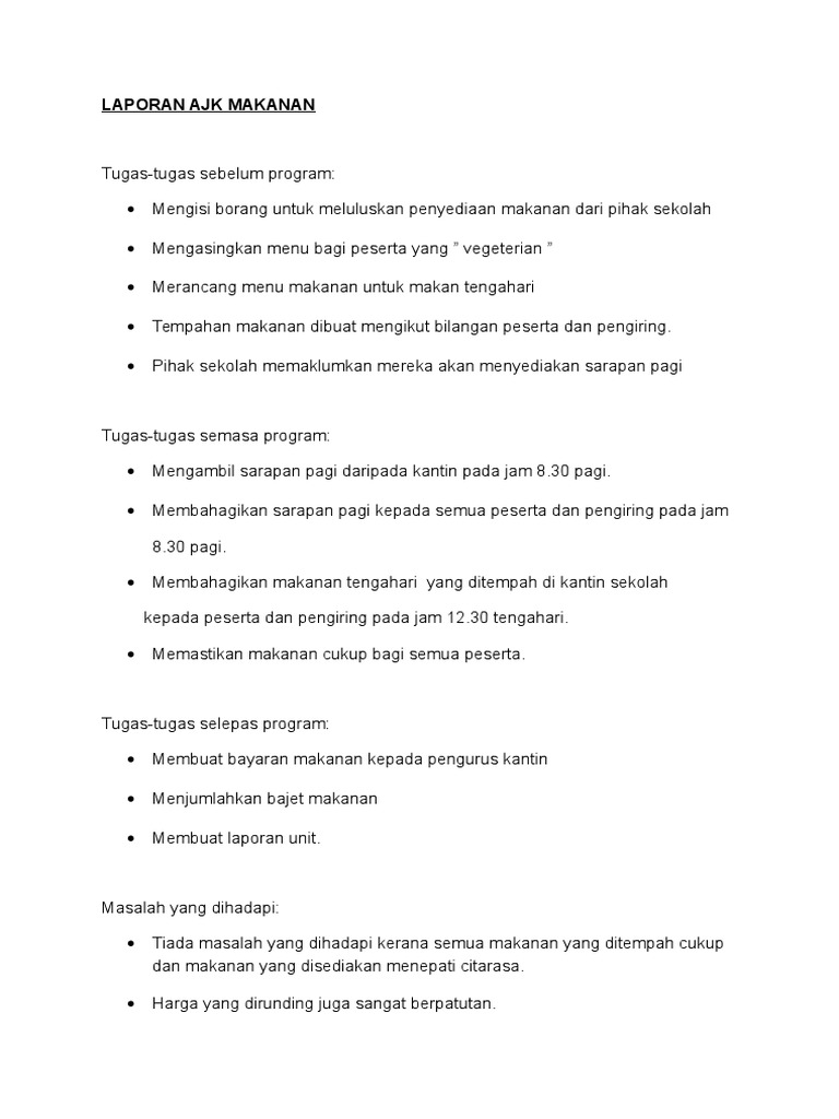 Ajk Makanan In English Jaga Kesehatan Lansia Dengan Makanan Bergizi Dan Olahraga Get Started With These 14 Words Alh Hadio from tse2.mm.bing.net Context sentences for makanan in english. What does makanan mean in english? Laporan ajk makanan kami telah berbincang dan mengambil kata sepakat untuk menyediakan makanan sebanyak dua kali iaitu sarapan pagi dan makan tengah hari. Unlike russian, english does not use the reflexive pronoun myself (себе) after the verb to feel. This feature allows you to check plagiarism on documents in other languages other than english. Hence, we say in english i feel well; Walau dimana, bila dan apa pun jua aktiviti yang. Download contoh laporan ajk makanan.