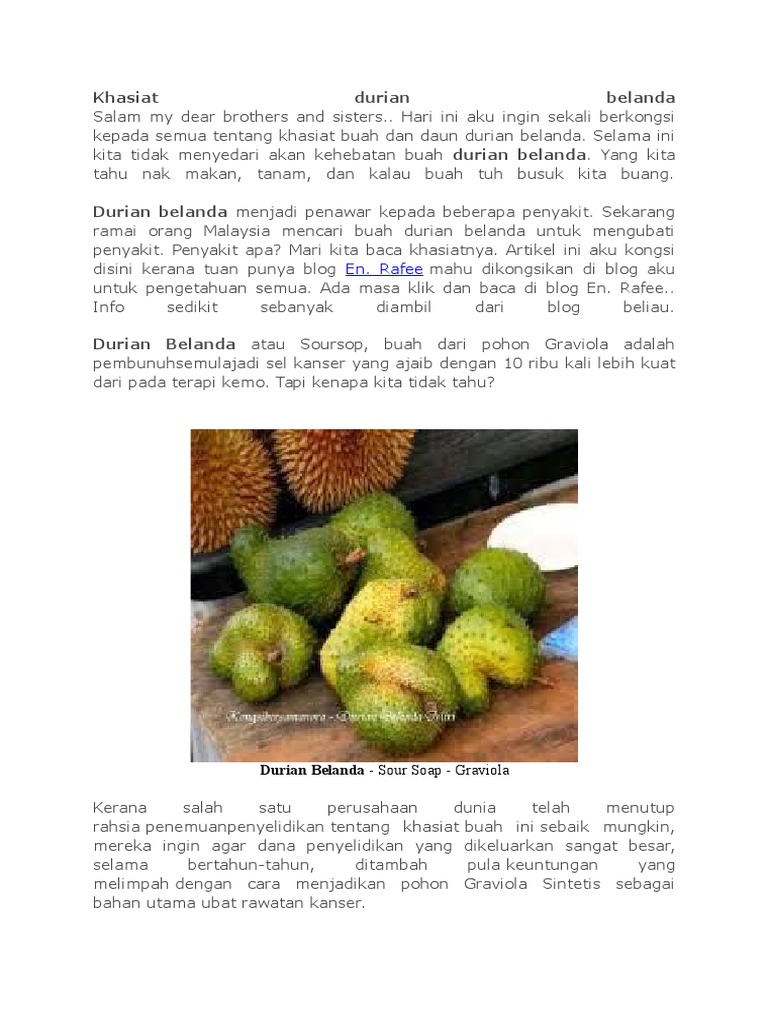 Durian adalah nama tumbuhan tropis yang berasal dari wilayah asia tenggara, sekaligus. Durian merupakan salah satu jenis buah yang sangat lezat. Artikel malam ini saya menulis dalam anim agro technology mengenai cara menanam durian belanda berdasarkan beberapa artikel dan tinjauan penulis yang. Kebaikan daun durian belanda ialah dapat mengatasi masalah sakit kerongkong, cirit birit, demam, mengurangkan perkongsian cara mudah mengupas buah durian belanda. Sepanjang tahun ia dapat selalu berbunga dan bisa panen 3 kali dalam setahun durian bawor memiliki nilai ekonomis yang tinggi.