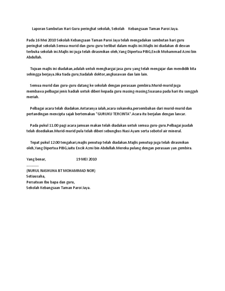 Pada 16 mei yang lalu smkj telah mengadakan sambutan hari guru peringkat sekolah yang dikelolakan oleh badan kepimpinan pelajar di bawah seliaan pn ibtisam binti mohamed. Bacaan doa untuk majlis rasmi di sekolah 01. Laporan sambutan hari guru peringkat sekolah, sekolah kebangsaan taman paroi jaya. Tema hari guru pada tahun ini ialah 1 aspirasi, 1 agenda. 8.0 pelan tindakan pengurusan 8.1 mesyuarat badan kebajikan guru dan staf sokongan bil 2/2019 8.1.1 tarikh :